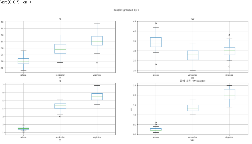boxplot 은 데이터 프레임의 형태로 가져와야 하므로 [[]] 을통해 dataframe 값을 가져왔다. 그 뒤 by를 통해 Y를 기준으로 그린다. Y는 종별로 나눠져 있고 각 종별로 SL 값의 box plot을 그린다.