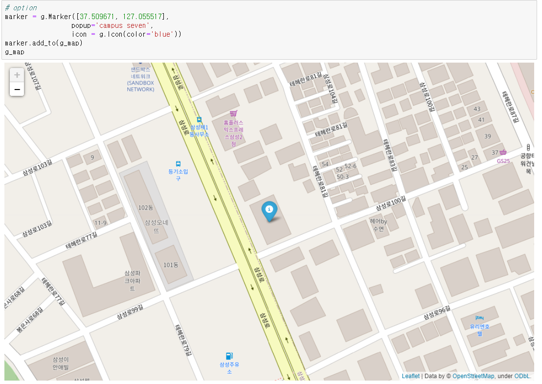 marker = g.Marker([37.509671, 127.055517], # 마커를 찍는 과정이다. 해당 위치의 마커를 찍고