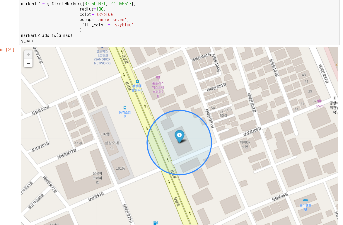 marker02 = g.CircleMarker([37.509671,127.055517], # CircleMarker를 통해 원형으로 보이게 한다.